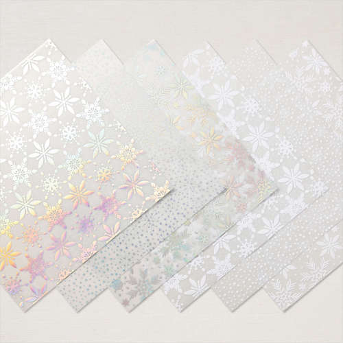 This unique paper includes three different snowflake designs in white vellum that feel like velvet or flock and iridescent foil that show different colors; all depend on what color is close by for the reflections. It is six different papers, six sheets: 2 each (one foil, one flock) of 3 designs.