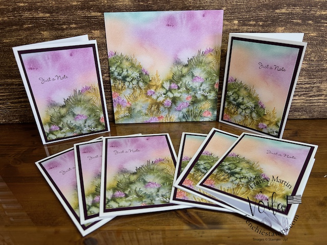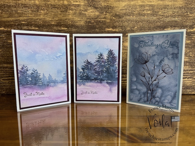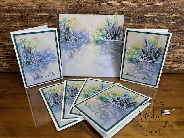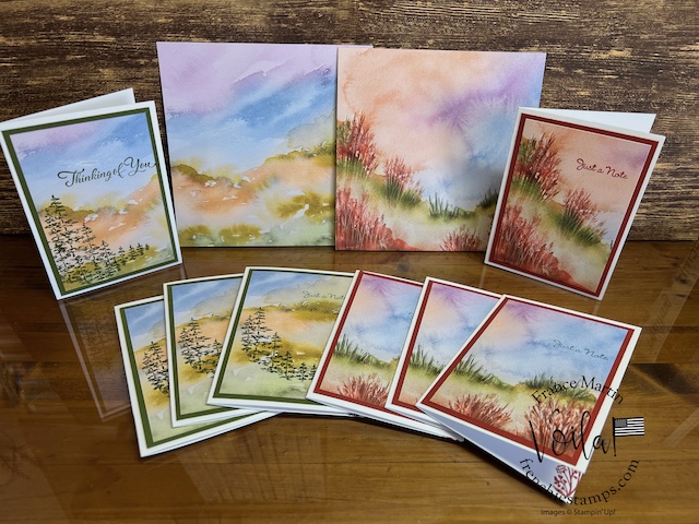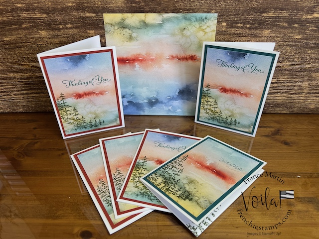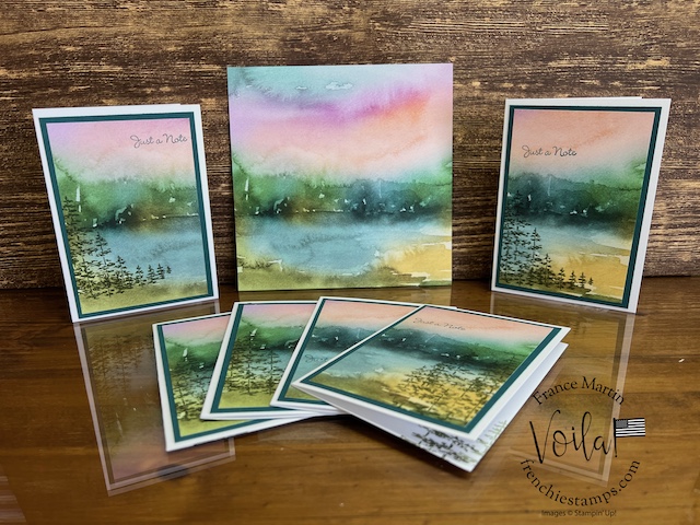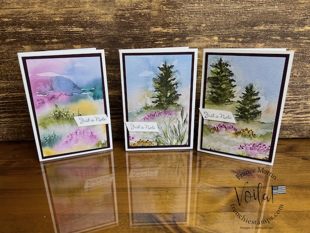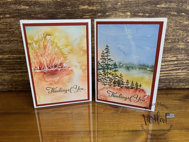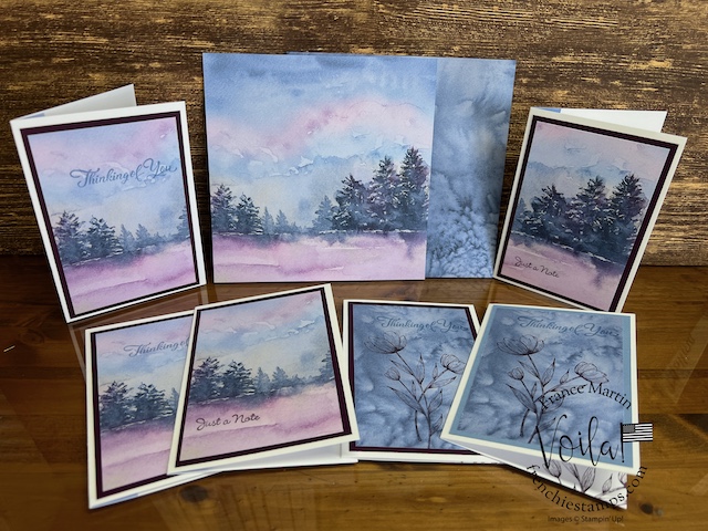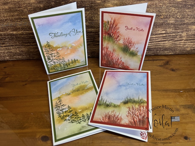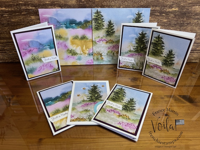 My stamp set of choice. I started with Spotlight Nature, but after a few designs, I wanted more nature, like trees, and the Encircle In Nature was the right choice. The trees and little wildflowers were just what I needed. I share in the video how I stamp the half circle of trees on these prints. The greeting stamp set is “Go To Greeting.” that set is retired 🙁 So look into your stash. I bet you can find greetings from the mixed stamp set for these cards.