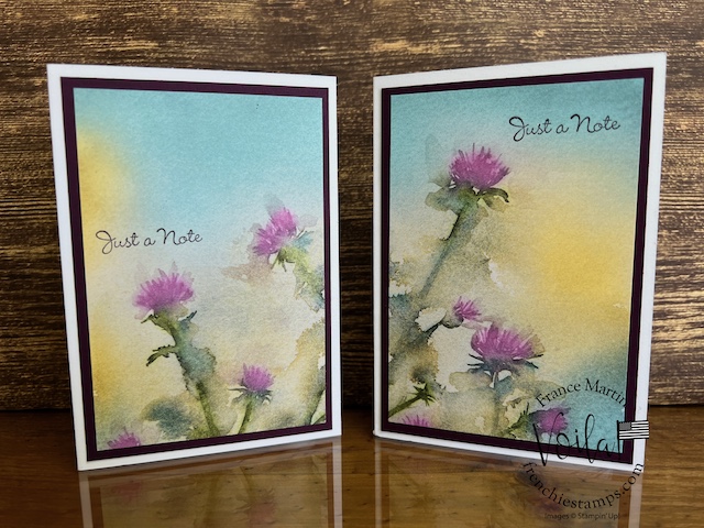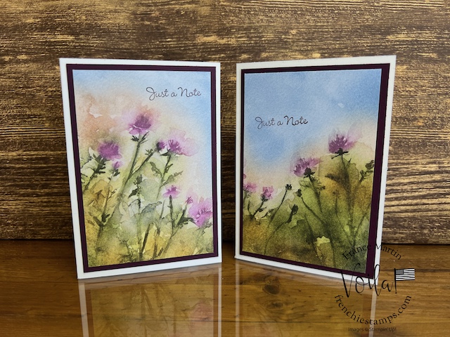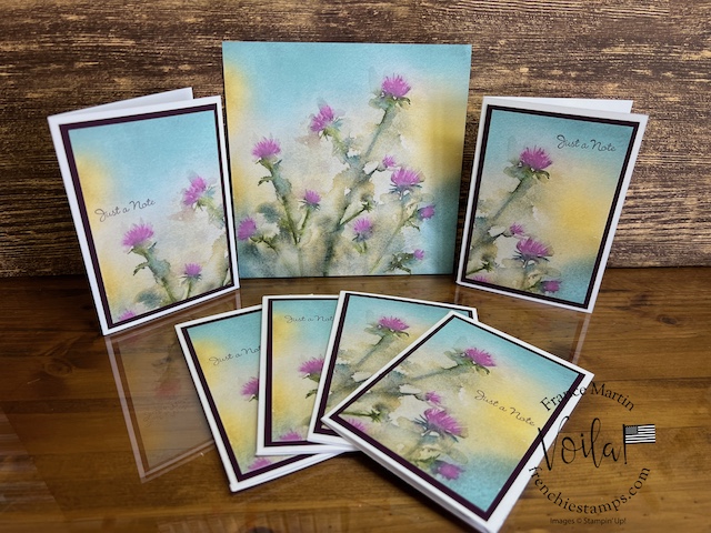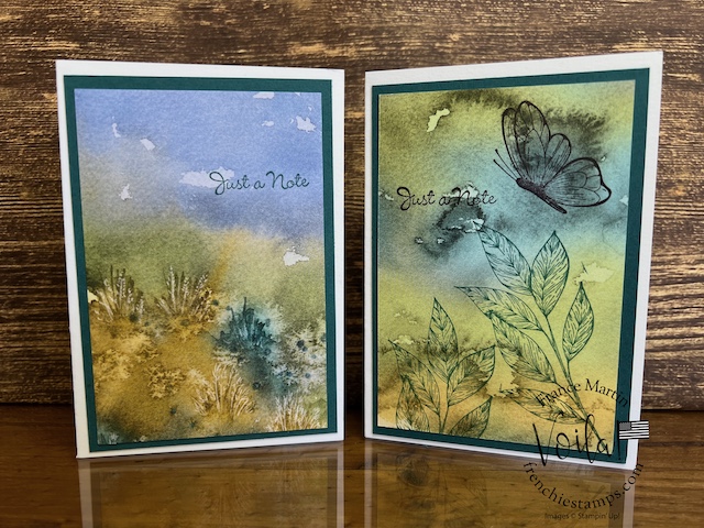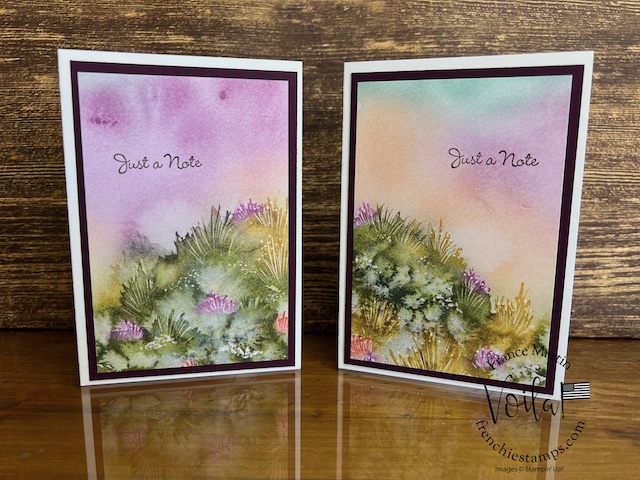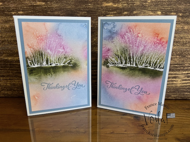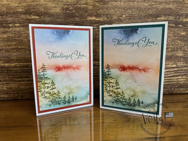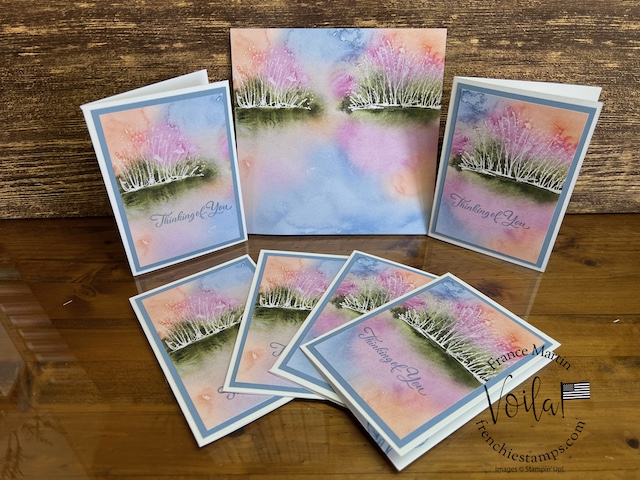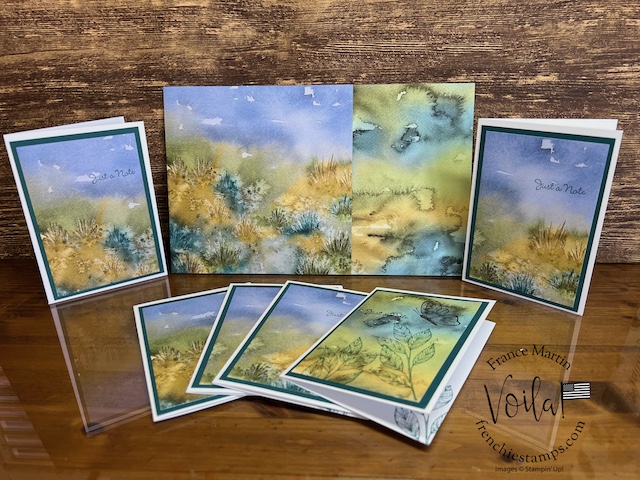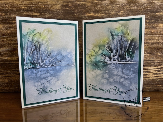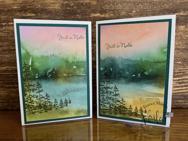 My stamp set of choice. I started with Spotlight Nature, but after a few designs, I wanted more nature, like trees, and the Encircle In Nature was the right choice. The trees and little wildflowers were just what I needed. I share in the video how I stamp the half circle of trees on these prints. The greeting stamp set is “Go To Greeting.” that set is retired 🙁 So look into your stash. I bet you can find greetings from the mixed stamp set for these cards.
