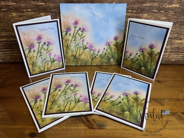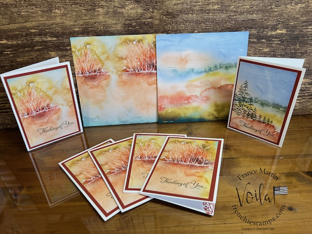 I created over nine dozen cards using one pack of this fantastic Thoughtful Journey paper, and even after that many cards, I’m not tired of looking at the beautiful scenery. You may ask, what will I do with all these cards? If you place an order on my site this month, you will be a lucky recipient of one of them. This scenery can easily be used for all occasions, including sympathy, birthdays, thank you, and thinking of you, to name a few.